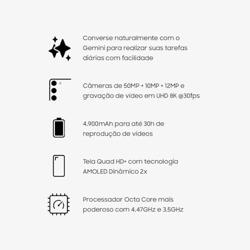 Performance Excepcional e Multitasking Equipado com o processador Snapdragon 8 Elite for Galaxy personalizado, o mais poderoso já feito para smartphones Galaxy, otimizado para gaming com ray tracing e otimização Vulkan, oferecendo experiência fluida e responsiva para todas as aplicações.