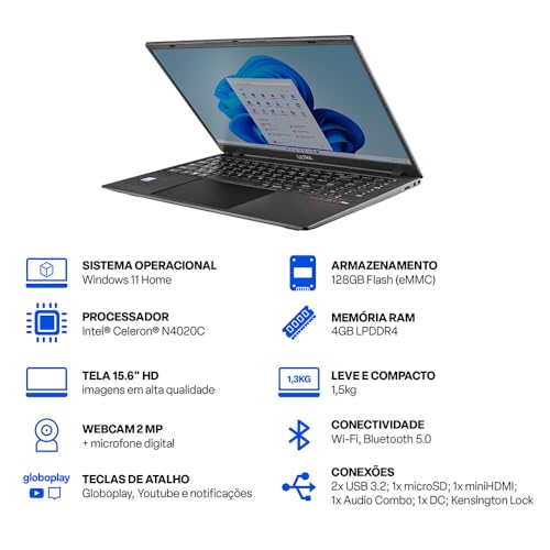 Com o processador Intel Celeron N4020C e 4GB de memória RAM, este notebook atende perfeitamente às necessidades básicas de produtividade, navegação na internet e tarefas cotidianas. O armazenamento SSD de 128GB garante inicialização rápida do sistema e acesso ágil aos arquivos.